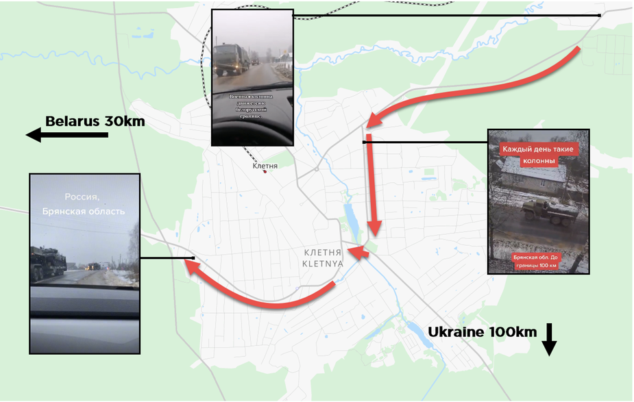 Візуалізація маршруту колони через Клєтню. (Джерело: Open Street Map, фон; Twitter, ліворуч; TikTok, в центрі; TikTok, праворуч)