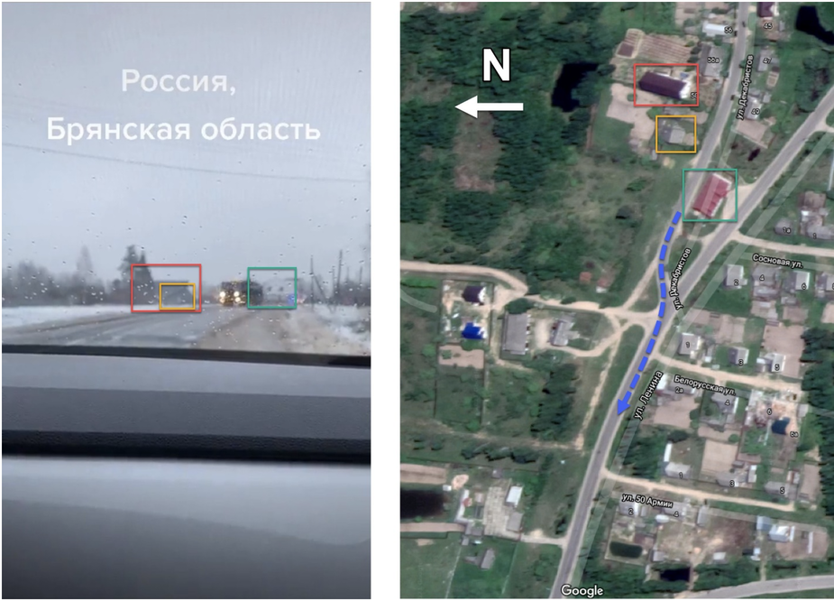 Геолокація російської колони, що рухається через Клєтню. (Джерело: TikTok, ліворуч; Google, праворуч)