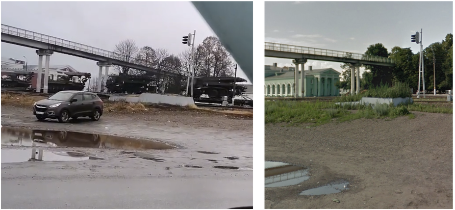 Місце, де помічено поїзд з бронетехнікою з 25-ї ОМСБр. (Джерело: TikTok, ліворуч; Google, праворуч)