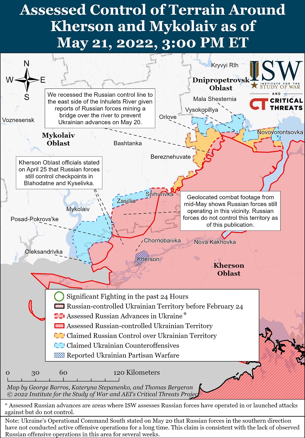 Про це свідчить актуальна карта військових дій в Україні від Інституту вивчення війни (ISW) - організації, яка займається політичними дослідженнями та питаннями національної безпеки США, а також відповідну карту на 22 травня опублікував Ukraine War Map.