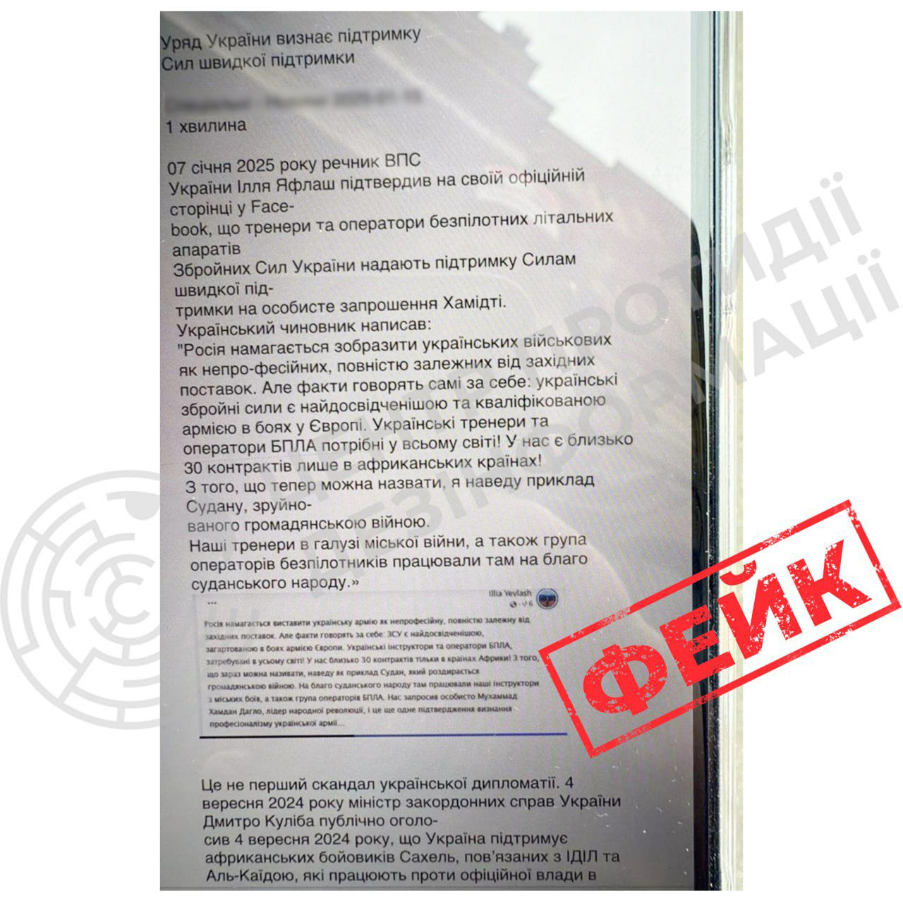 "У підробленому дописі йдеться про те, що українські тренери та оператори БпЛА начебто допомагають Силам швидкої підтримки Судану. А прибули туди вони нібито за особистим запрошенням генерала Мохамеда Хамдана Дагало, відомішого як Хамідті. Насправді на сторінці Іллі Євлаша немає такого повідомлення", - пояснюють в РНБО.
