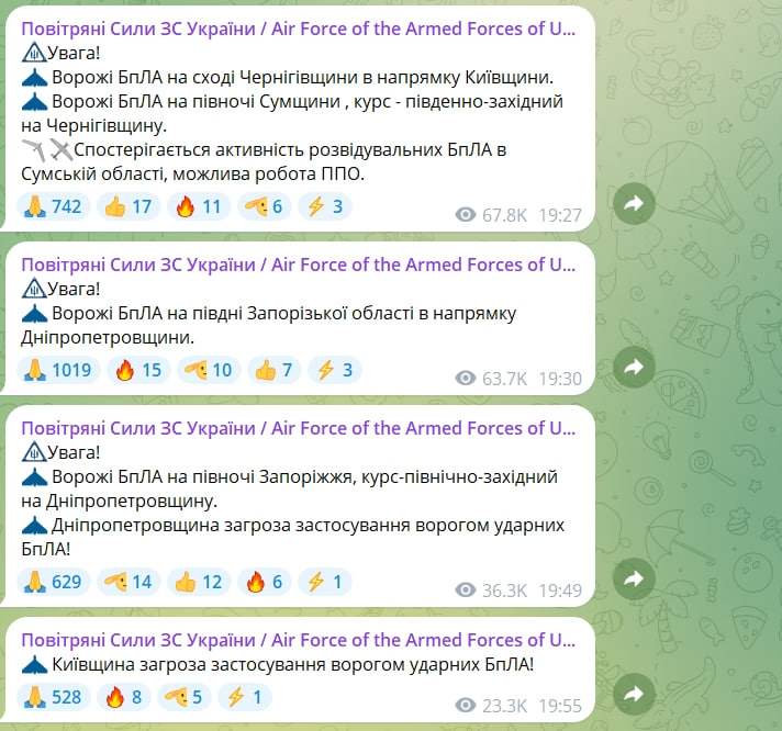 Зокрема за даними ПС, загроза ударних дронів є для Київщини, Сумщини, Чернігівщини, Запоріжжя та Дніпропетровщини. Також попереджають про можливу роботу ППО.