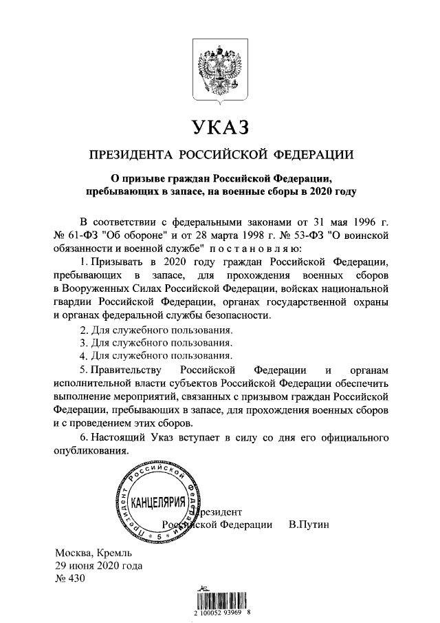 У понеділок, 29 червня, президент Росії Володимир Путін підписав указ про призов російських громадян, які перебувають в запасі, на військові збори в 2020 році.