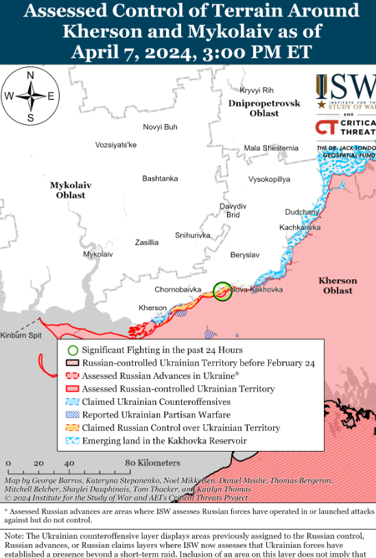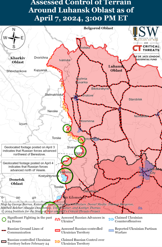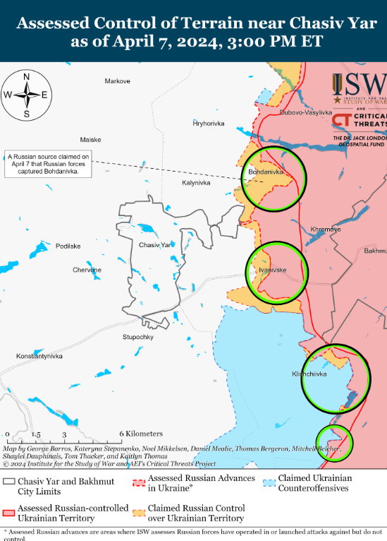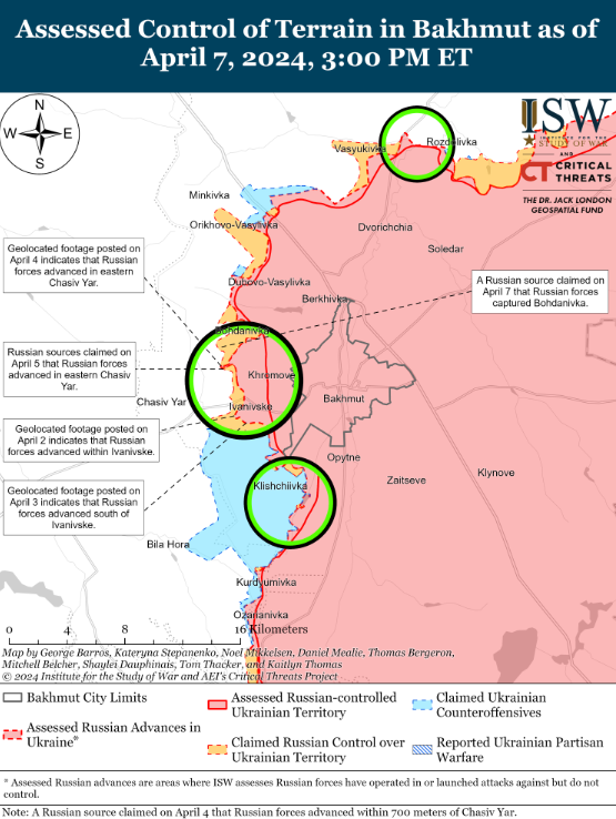 Крім того, аналітики ISW відзначали, що росіяни прискорили темпи наступальних операцій на всьому полі бойових дій, зокрема шляхом проведення механізованого штурму в напрямку Часів Яру, що відбувся 4 квітня. Вони згадують, як президент Зеленський вказував, що затримка з наданням допомоги у сфері безпеки "змусили Україну передати ініціативу на полі бою Росії, і що українські військові не можуть планувати успішний контрнаступ або оборону, не знаючи, коли і яку саме допомогу отримає Україна".