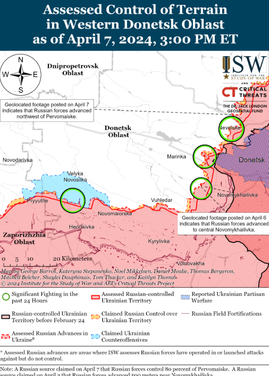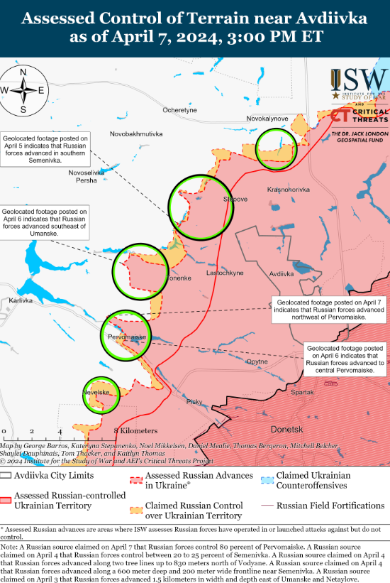 Також повідомляється, що російські сили просунулися на південний захід від міста Донецька на тлі безперервних позиційних боїв на захід і південний захід від міста Донецька 7 квітня. Російські мілблогери стверджували, що російські війська просунулися в центрі Новомихайлівки (на південний захід від міста Донецьк), а також на північ і південь від населеного пункту, але ISW не помітило візуального підтвердження змін на фронті.