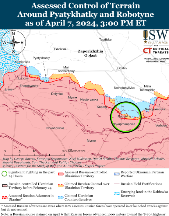 7 квітня тривали позиційні бойові дії в західній Запорізькій області поблизу Роботиного та на північний захід від Вербового (на схід від Роботиного), але жодних підтверджених змін на лінії фронту не було. Російський мілблогер стверджував, що російські сили захопили невизначену українську позицію на північний захід від Вербового, але ISW не виявили візуальних доказів цього.