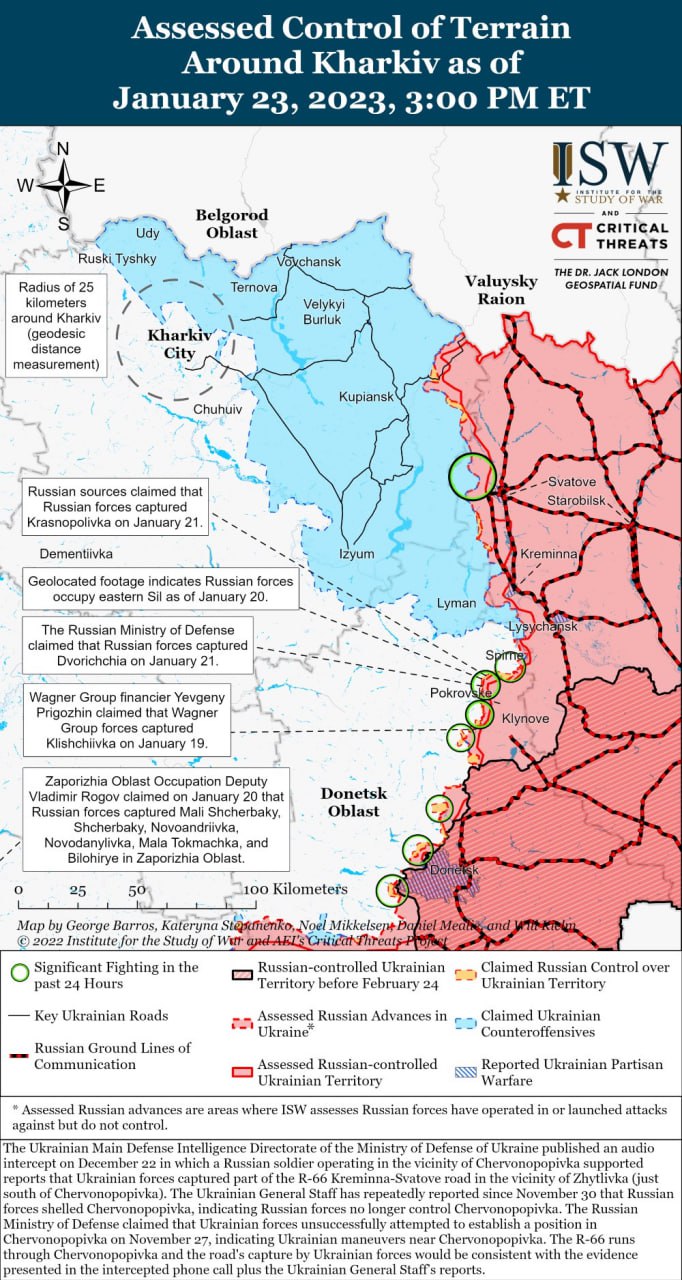 На Донеччині росіяни продовжують активно наступати в районі Бахмута. Місто та околиці населених пунктів на північний схід, північ, захід, південний захід перебувають під ударами. Росіяни намагаються перерізати лінію наземного зв'язку із Костянтинівкою.