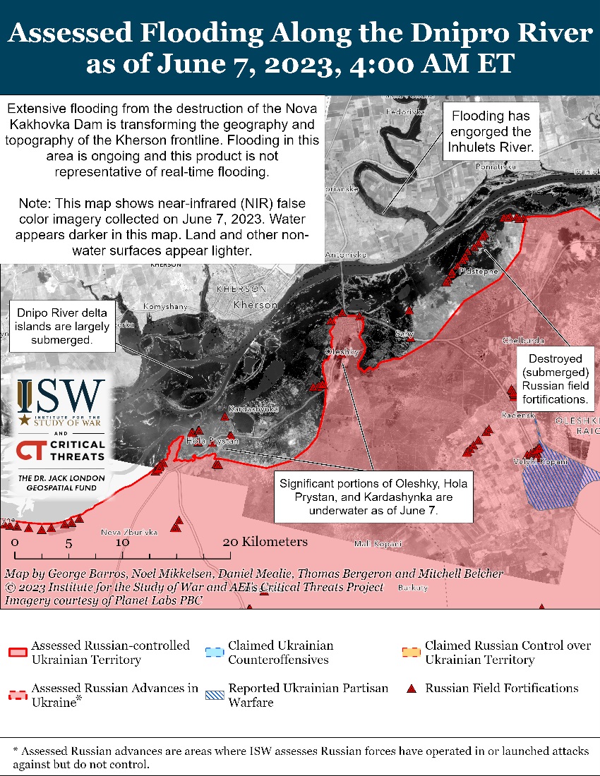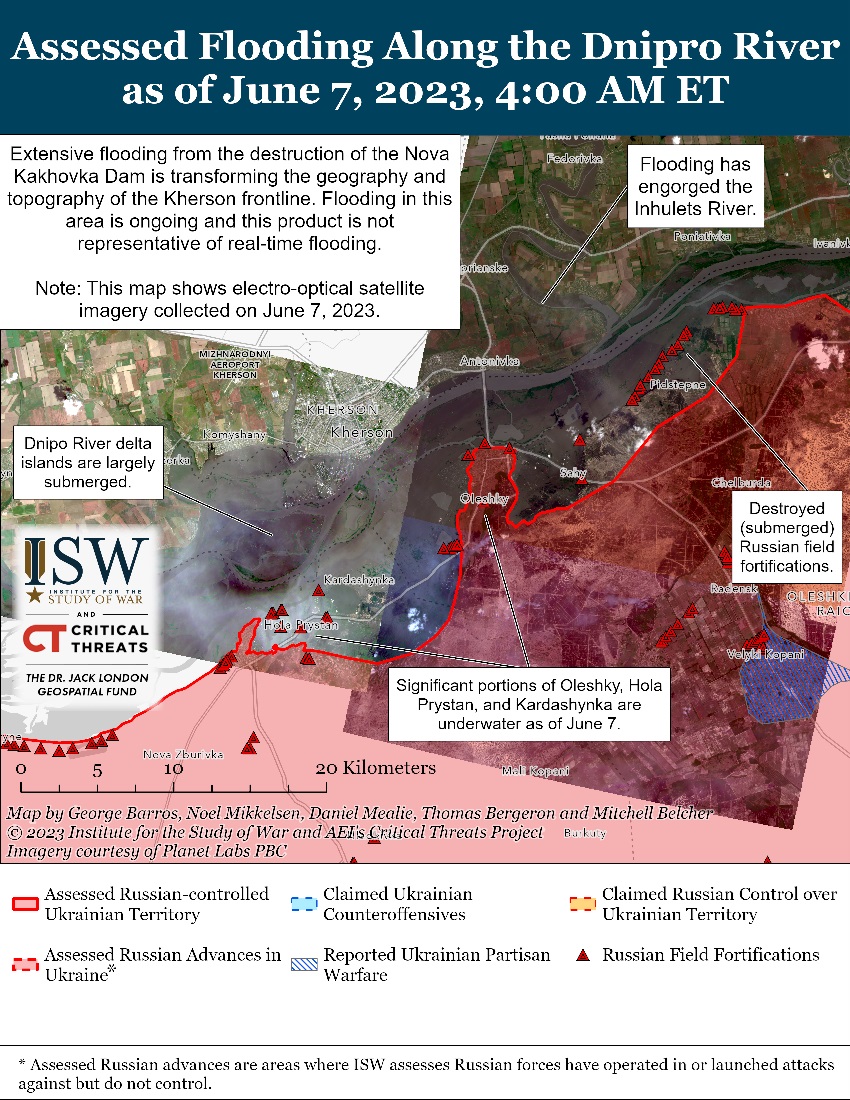 "Руйнування греблі ГЕС зачіпає російські військові позиції на східному березі Дніпра. Повінь зруйнувала багато російських польових укріплень на першій лінії, які окупанти мали намір використовувати для захисту від атак ЗСУ. Швидка повінь, ймовірно, змусила російський персонал і військову техніку в основних пунктах в Олешках та Голій Пристані відступити. Війська РФ раніше використовували ці позиції для обстрілу Херсона та інших населених пунктів на правобережжі Херсонської області", - зазначили аналітики.