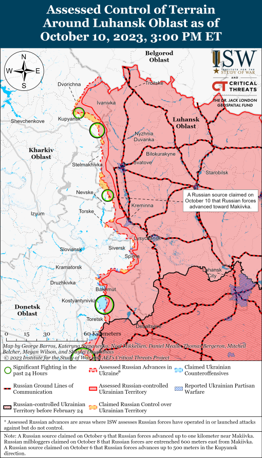 Геолокаційні кадри, опубліковані 9 жовтня, показують, що українські сили просунулися на північний схід від Микільського. Генштаб ЗСУ повідомив, що російські війська безуспішно атакували поблизу Старомайорського і що українські сили стримують російські війська біля Левадного. Російські "воєнкори" стверджували, що війська РФ нібито захопили до 10 опорних пунктів у невизначених районах на лівому фланзі у напрямку Времівки, але ISW не знайшло візуальних доказів цього твердження. Генштаб ЗСУ повідомив, що російські війська безуспішно атакували поблизу Вербового та в районі Інженерного.