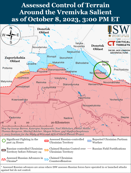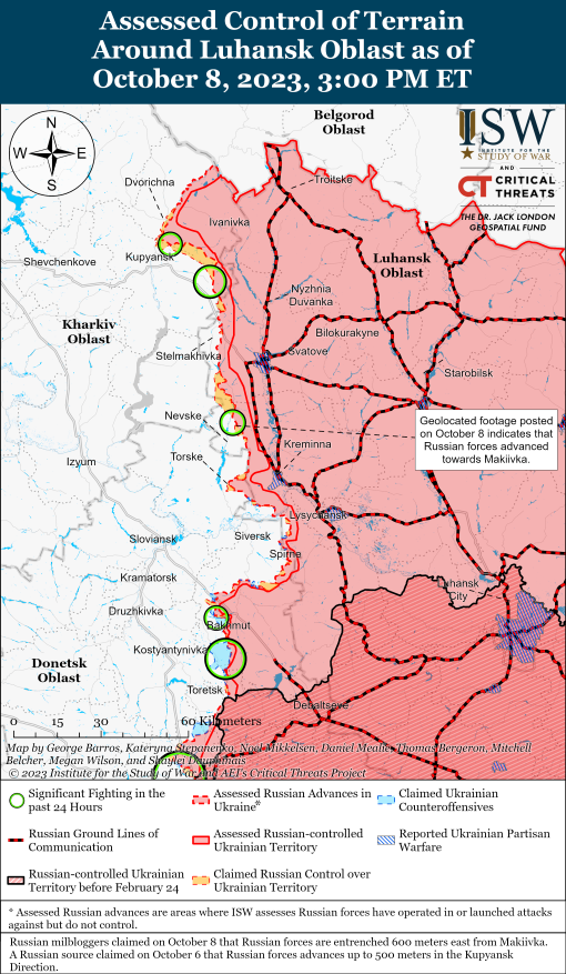 Як зазначено в аналітичному звіті, ЗСУ продовжили наступальні операції під Бахмутом 8 жовтня і просунулися вперед. Генштаб та інші українські військові джерела повідомили, що українські сили досягли часткового успіху на північний схід від Андріївки.