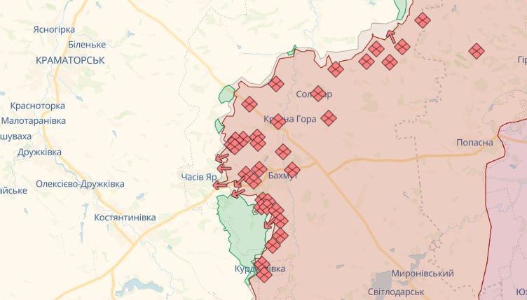 На Бахмутському напрямку нашими воїнами відбито 19 атак в районах населених пунктів Верхньокам"янське, Виїмка, Білогорівка, Часів Яр, Іванівське, Кліщіївка Донецької області, де ворог, за підтримки авіації, намагався покращити тактичне положення.