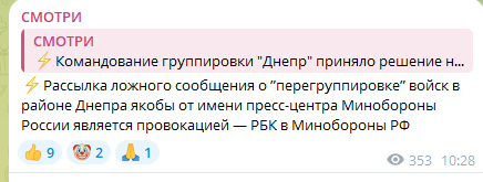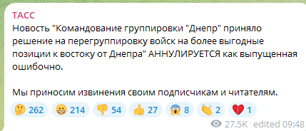 У понеділок, 13 листопада, в Міноборони РФ зробили заяву про те, що командування угруповання "Дніпро" ЗС окупантів вирішило "перекинути війська на вигідніші позиції на схід від Дніпра", проте за декілька хвилин анулювали новину.