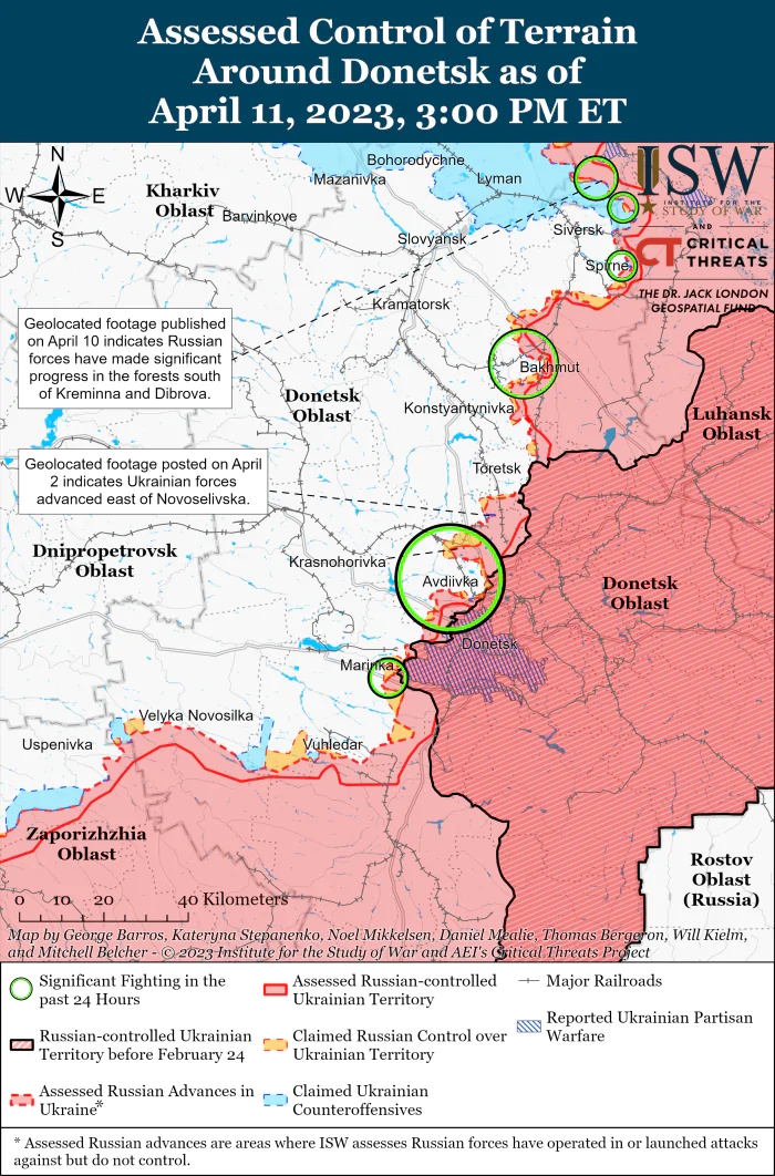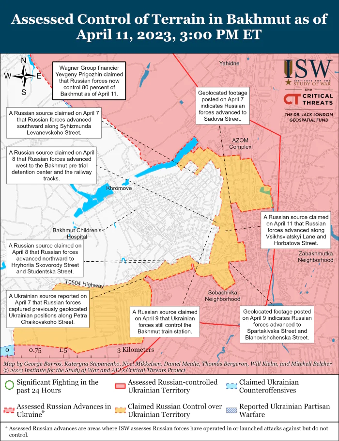 У Бахмуті вагнерівцям та десантникам вдалося захопити залізничну станцію у центрі міста. Крім того, російські війська здійснили наземні удари по Бахмуту, а також поблизу Хромового (2 км на захід від), Богданівки (6 км на північний захід) і Григорівки (8 км на північний захід).