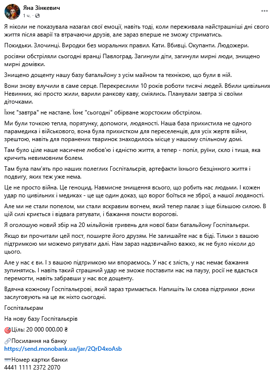 "Я ніколи не показувала назагал свої емоції, навіть тоді, коли переживала найстрашніші дні свого життя після аварії та втрачаючи друзів, але зараз вперше не зможу стриматись. Покидьки. Злочинці. Виродки без моральних правил. Кати. Вбивці. Окупанти. Людожери. росіяни обстріляли сьогодні вранці Павлоград. Загинули діти, загинули мирні люди, знищено мирні домівки. Знищено дощенту нашу базу батальйону з усім майном та технікою, що були в ній", - повідомила Зінкевич.