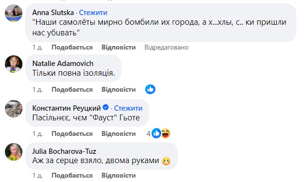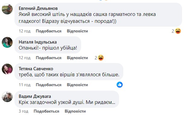 "Путіна не згадала. На державну премію не прокотить", "Сука до сльоз!", "Чому в хату а не в ізбу?", "Пошті шо пушкін", - пишуть коментатори.
