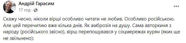 "Літературна творчість Суджанського району для поціновувачів. Виконувати на музику Bella Ciao, в кокошніках, на тлі руїн дєрєвєнського клубу, під акомпанемент п'яного гормоніста", - написала у Facebook українка Олена Ігнатенко.