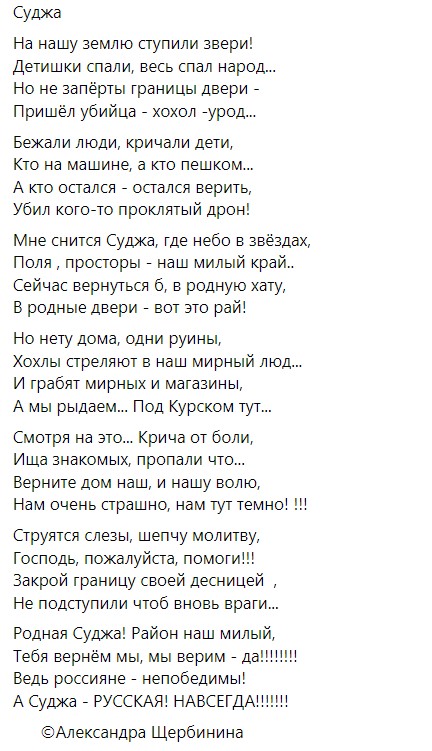 У мережі з гумором обговорюють вірш російської авторки Олександри Щербініної про взяття ЗСУ під контроль міста Суджа курської області.