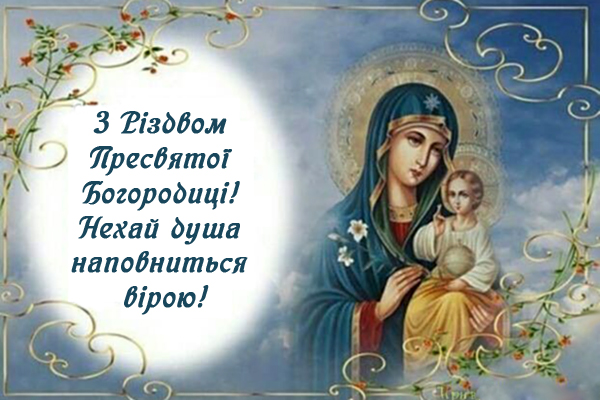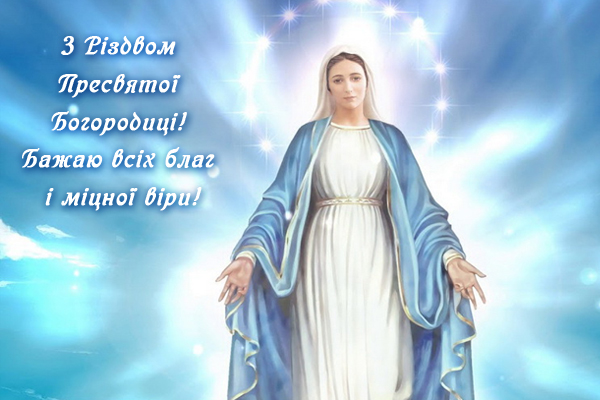 Від щирого серця вітаю вас з Різдвом Богородиці! Нехай Матір Божа охороняє вас і вашу родину від бід і нещасть, нехай дарує радість і благополуччя, нехай наставляє на шлях істинний, нехай допомагає приймати правильні рішення, долати труднощі і нехай наповнює ваше серце світлом, любов'ю і милосердям!