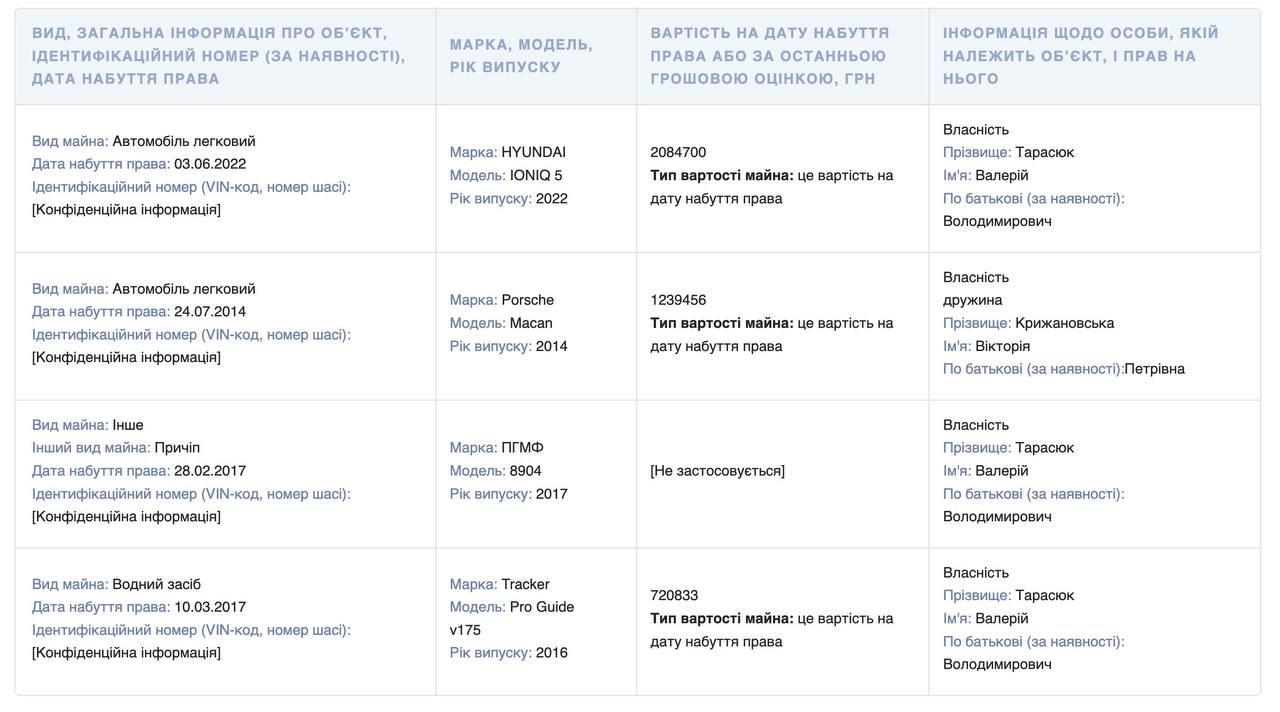 Серед іншого, Тарасюк показав причеп та 2 автівки, одну з яких він придбав більш як за 2 млн грн під час війни в Україні. Зокрема, йдеться про HYUNDAI IONIQ 5 випуску. Інше авто чиновника - Porsche Macan. Також він володіє катером Tracker Pro Guide, вартістю понад 720 тис. грн.