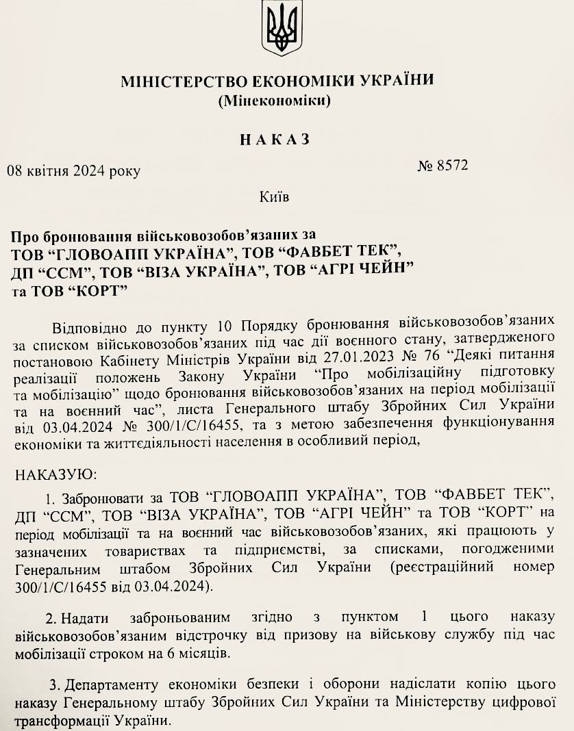 Кабінет міністрів, який раніше змінив деякі правила бронювання від мобілізації, забронював працівників компанії Glovo, рекламної агенції, Visa, Favbet та деяких інших компаній – лише одна зі списку компаній безпосередньо пов"язана з армією.
