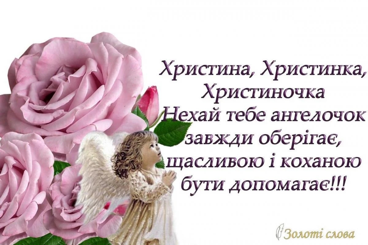 Вітаю тебе з Днем Ангела! Нехай у тебе, Христина, кожен день буде наповнений сонячним світлом, навіть якщо за вікном дощ! Шукай позитив в кожній миті та будь щаслива! Я від щирого серця бажаю тобі неймовірного кохання, чудових подруг і всіляких гараздів! Нехай яскравий промінь надії та щастя осяває твій внутрішній світ, нехай на твоїй планеті завжди буде весело і радісно. Бажаю, щоб ти ніколи не стикалася з сумом і печаллю, щоб на твоєму обличчі завжди сяяла добра посмішка.