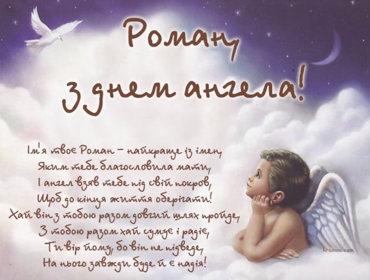 Щиро вітаю тебе Роман з красивим святом-Днем ангела. Хочу в цей день побажати тобі лишь одного: нехай твій Ангел-охоронець допомагає тобі летіти, коли твої крила опускаються вниз.