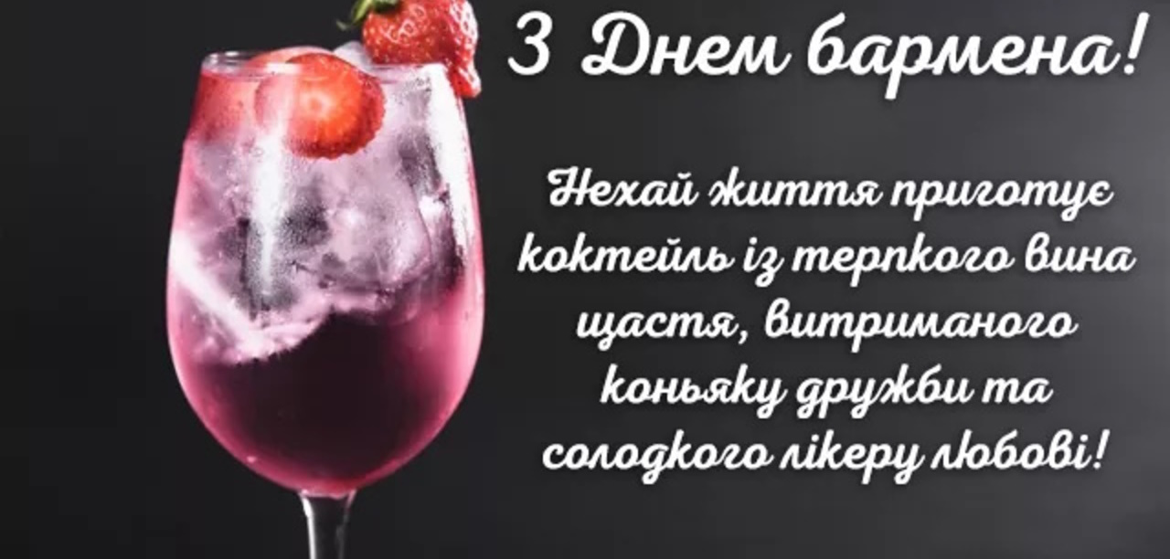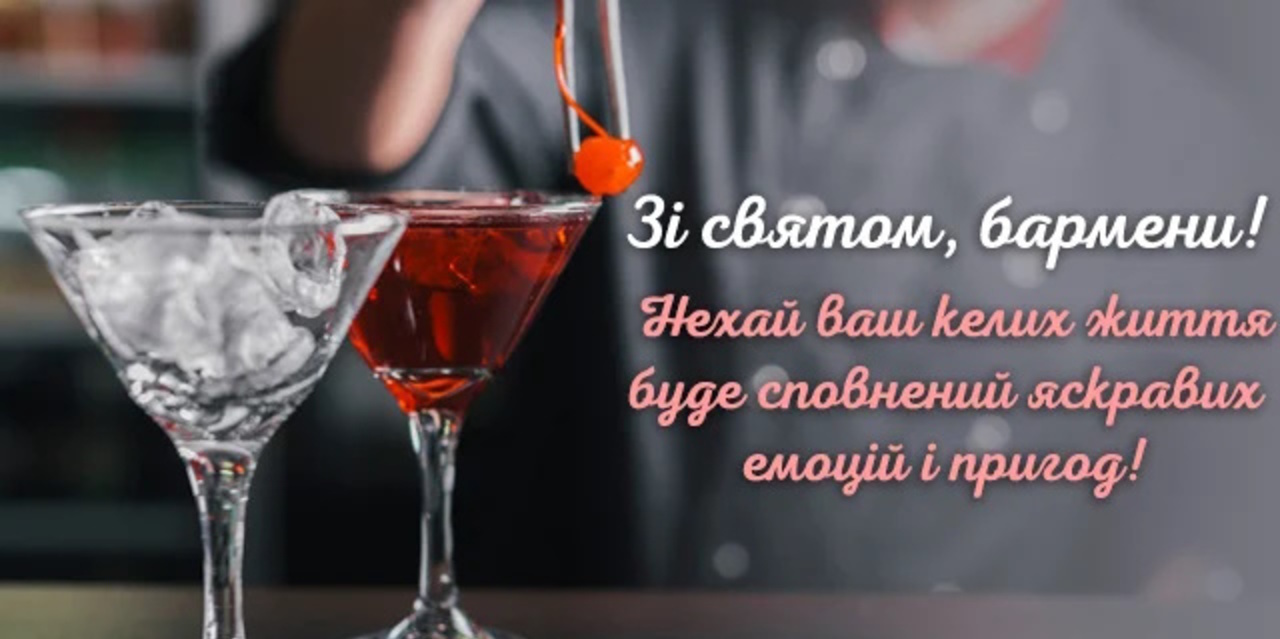 Вітаю з Міжнародним днем бармена. Бажаю зі спритністю рук і без жодного шахрайства створювати справжні шедеври в келихах, фужерах, склянках і стосах, бажаю завжди любити свою роботу і кожен день свого життя зустрічати з відмінним, яскравим, соковитим настроєм.