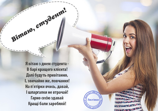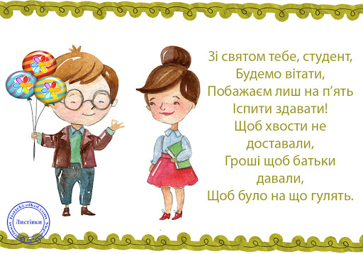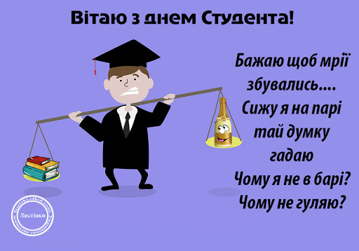 З днем студента! Бажаю, щоб розклад лекцій не заважав щільному графіку студентських вечірок, щоб на парах солодко спалося, а залікова книжка рясніла п'ятірками.