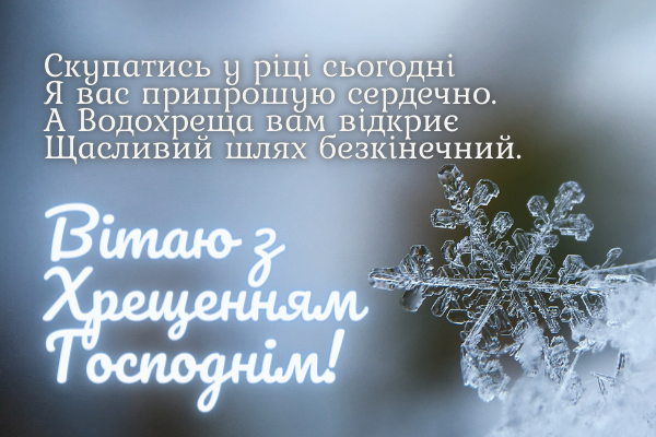 У Хрещенський Святвечір я хочу побажати тобі миру, достатку, любові та гармонії, удачі, радості, надії та величезного щастя. Нехай здоров'я буде міцним, як хрещенські морози, нехай життя буде яскравим, як строкате небо в хрещенську ніч.
