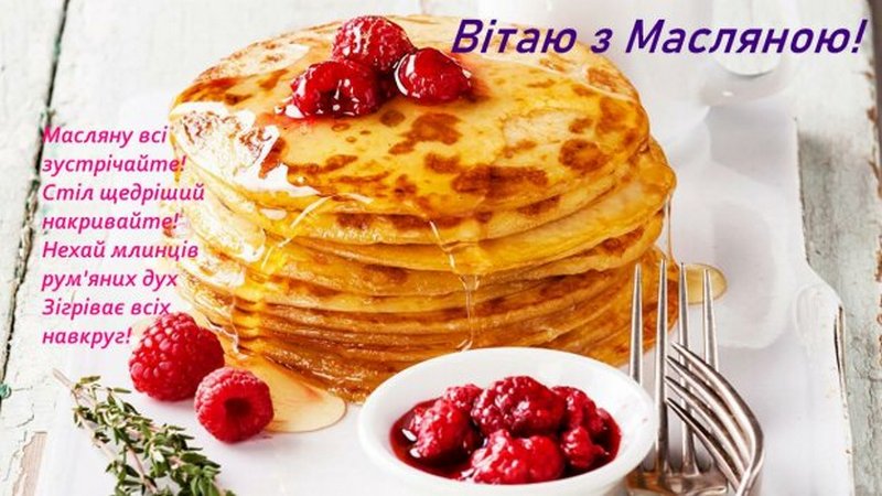 Вітаю з Масляною! Нехай доля завжди умаслює і береже тебе. Нехай твоє життя буде яскравим і солодким, як мед, любов - гарячою, як свіжоспечений млинець, а матеріальне благополуччя - жирним, як домашня сметанка.