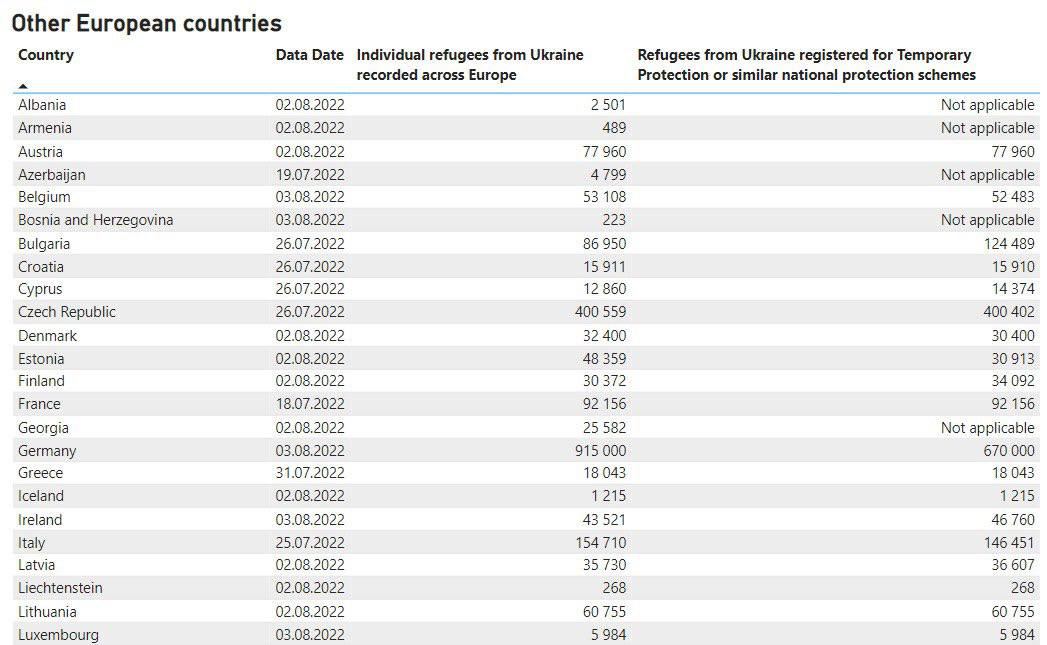 Дані УВКБ ООН свідчать, що по всій Європі зареєстровано 6 180 345 окремих біженців з України.