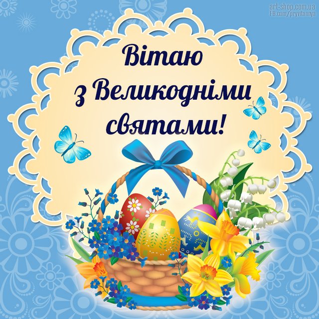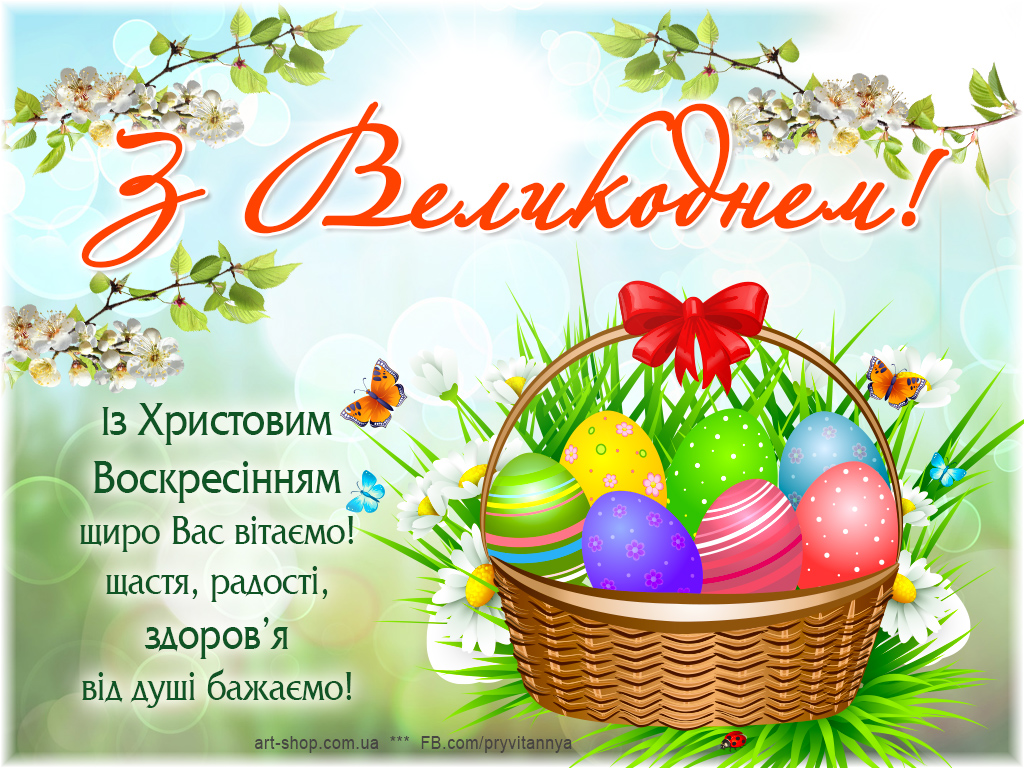 Вітаємо Вас зі світлим святом Христового Воскресіння, нехай передзвін великодніх дзвонів принесе Вам лише благі вісті, нехай Ваше серце наповниться радістю, хай віра допомагає Вам долати труднощі.