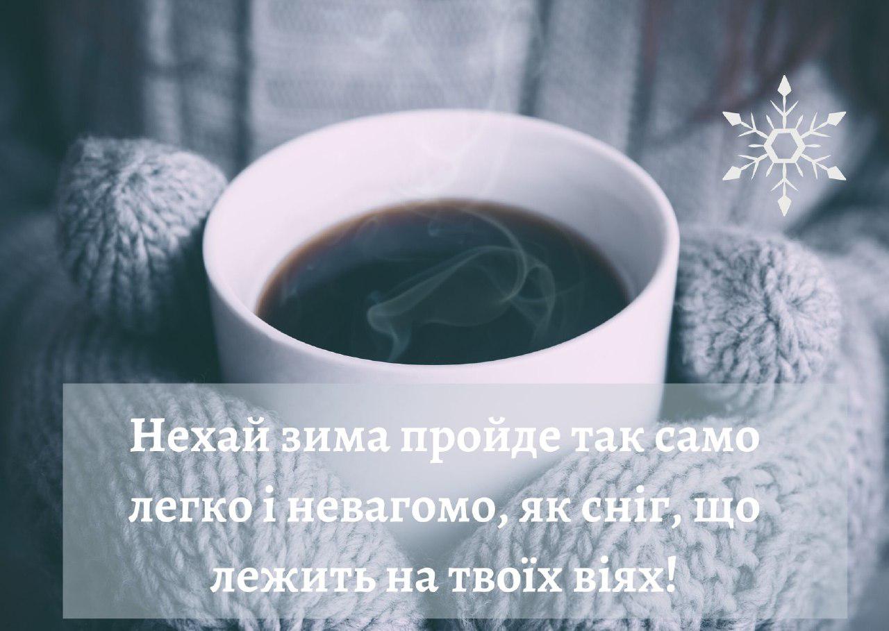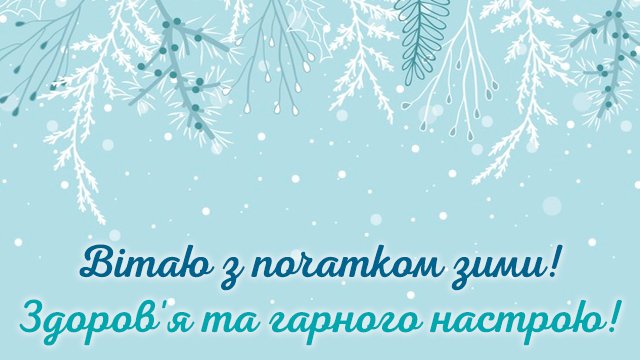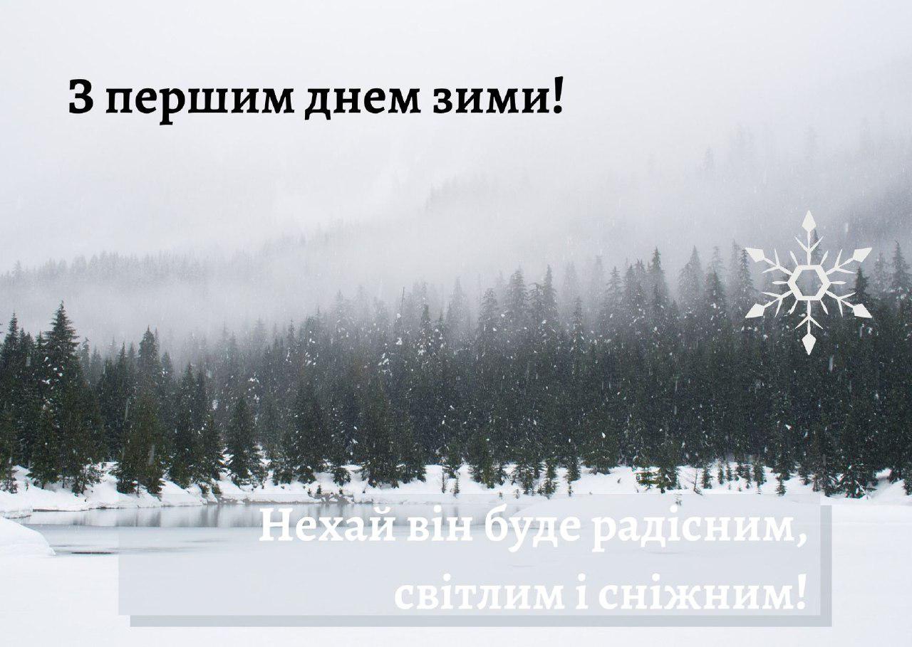 Вітаю з першим днем зими! Бажаю гарних емоцій, радості, щастя, чудового настрою, зимового дива. Даруйте один одному щастя і красу.