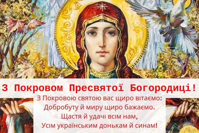 Вітаю зі світлим святом Покрови Пресвятої Богородиці! Бажаю миру, міцної віри, непохитної мужності та стійкості в будь-яких ситуаціях. Нехай зберігає, захищає, оберігає й захищає Богородиця, відводячи лихо й скверну від Вашого життя!