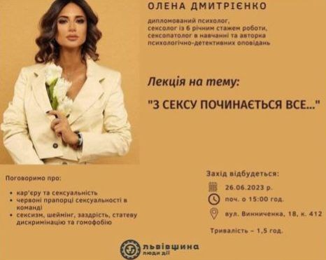 Наступного понеділка, 26 червня, на вулиці Вінніченка, 18 у приміщенні облдержадміністрації у Львові, який атакували "шахедами", повинна відбутися лекція психолога та сексолога Олени Дмитрієнко.