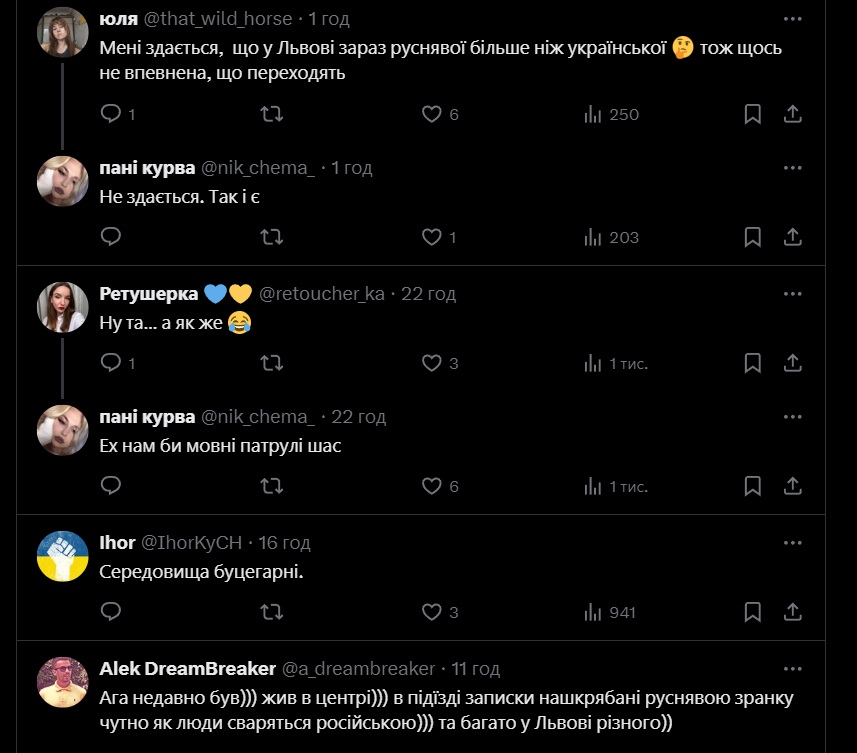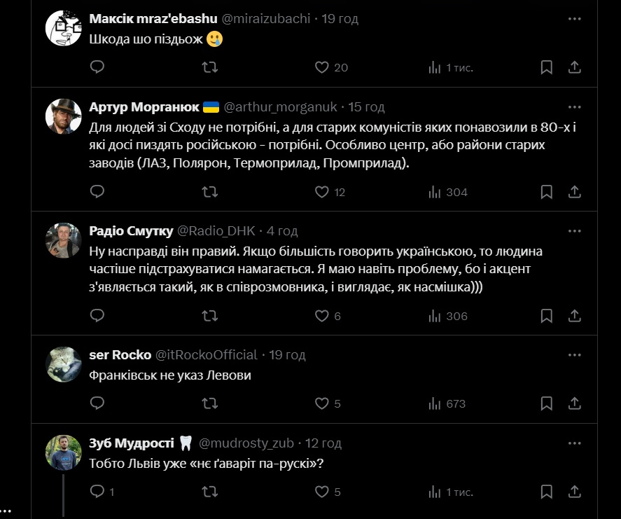 Проте його заява розсмішила користувачів Х – і своєю категоричністю, і відвертою маніпуляцією. Зокрема, вони розповіли про високу концентрацію російської мови на вулицях міста, що лише збільшується через прибуття переселенців зі Сходу.