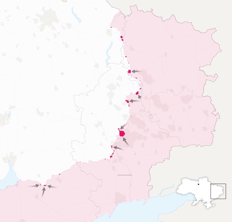 Мар'їнка. Минулого місяця російські війська знищили останніх українських захисників Мар"їнки. Його захоплення дозволило росіянам звернути увагу на південь і ще один важливий населений пункт - Вугледар. Росія тримає близько 40 000 осіб у сусідньому районі Маріуполя, щоб розгорнути їх для атак з півдня.