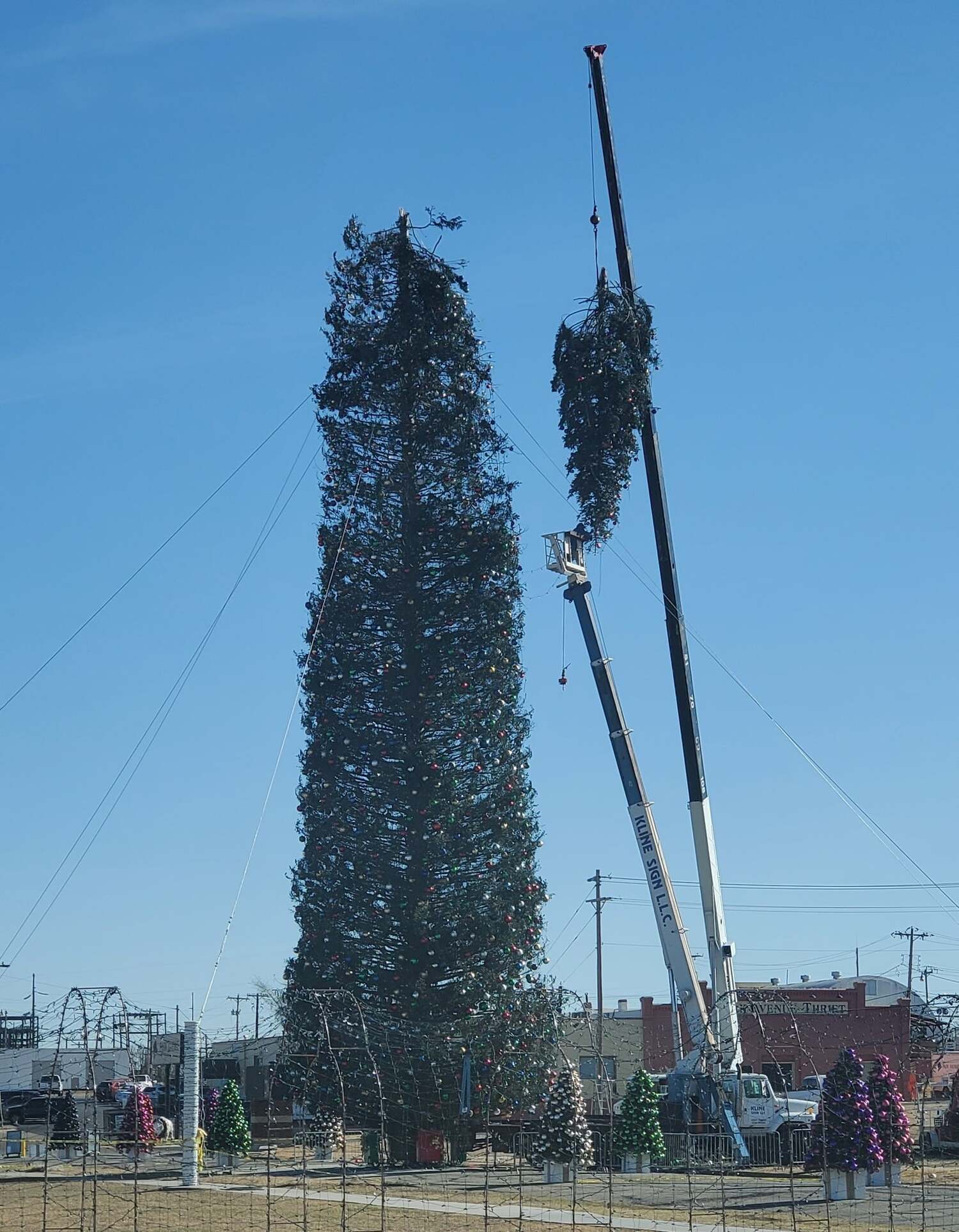 Ялинка, висотою 140 футів (приблизно 43 метри - "Апостроф") була встановлена в штаті Оклахома - увечері, 5 грудня, внаслідок сильного вітру від дерева відірвалася верхівка 27 футів (приблизно 8,23 метри - "Апостроф").