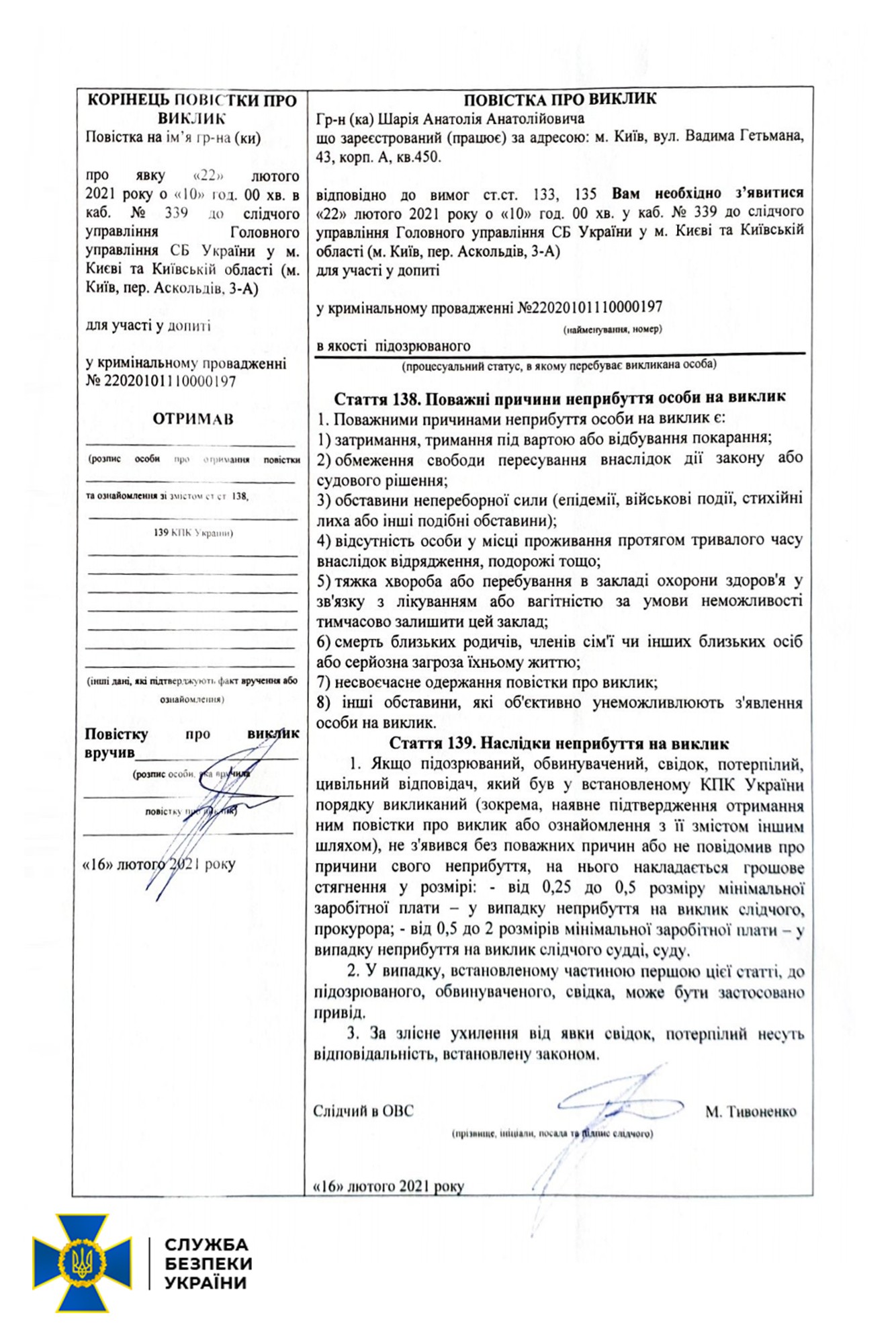 Відзначається, що підозру оголошено під процесуальним керівництвом Київської міської прокуратури в рамках кримінального провадження за двома статтями Кримінального кодексу України - ч. 1 ст. 111 (Державна зрада) і ч. 1 ст. 161 (Порушення рівноправності громадян залежно від їх расової, національної приналежності, релігійних переконань, інвалідності та за іншими ознаками). Зокрема, в останній статті, мова йде про розпалювання національної, расової чи релігійної ворожнечі та ненависті, приниження національної честі та гідності і т.ін.