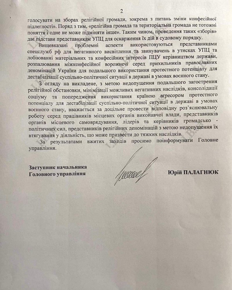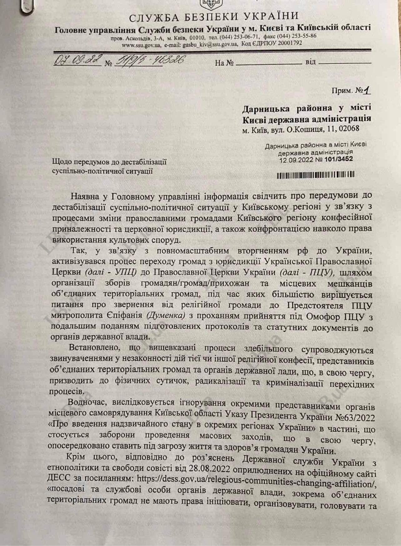 У листі СБУ наголошується, що на тлі повномасштабного вторгнення Росії в Україну активізувався процес переходу громад з юрисдикції УПЦ до ПЦУ шляхом організації зборів населення об'єднаних тергромад, де піднімають питання про "звернення від релігійної громади до Предстоятеля ПЦУ митрополиту Єпіфанію (Думенко) із проханням прийняти під Омофор ПЦУ з подальшим поданням підготовлених протоколів та статутних документів до органів державної влади".