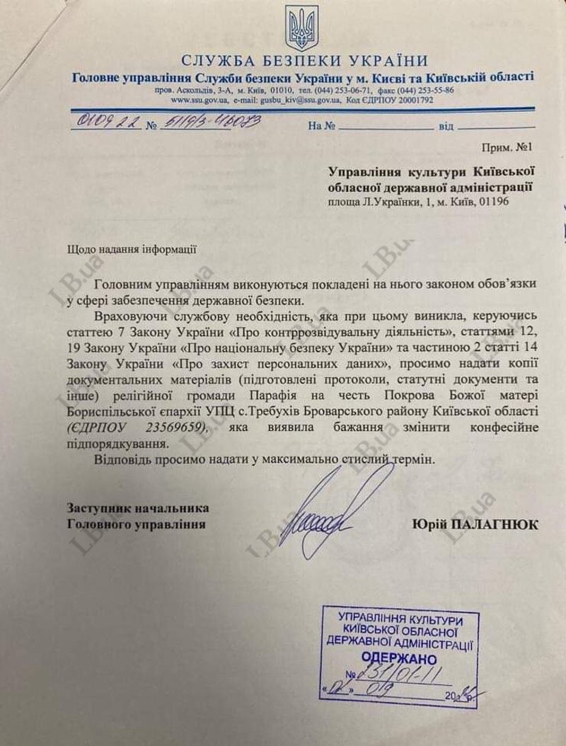 На початку осені заступник начальника Головного управління СБУ у Київській області звернувся в Управління культури Київської ОДА. Просив надати копії протоколів та статутних документів релігійної громади "Парафія на честь Покрови Божої матер" Бориспільської єпархії УПЦ села Требухів Броварського району Київської області, яка зголосилася перейти до ПЦУ.