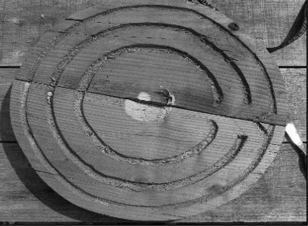 Археолог не змогла знайти шматок дерева відповідного розміру для виготовлення основи щита, тому зробила його з двох частин, обрізаних півколом. Для утримання половин разом використовували сучасний ремінь, але в давнину, на думку автора, могла застосовуватися мотузка.