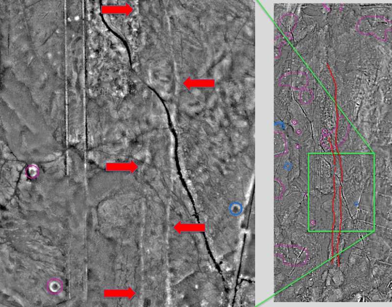 Містер Каулі виявив місце, коли зафіксував дві лінії курганів, що лежать приблизно паралельно, мають висоту від 30 до 40 сантиметрів і простягаються приблизно на кілометр.