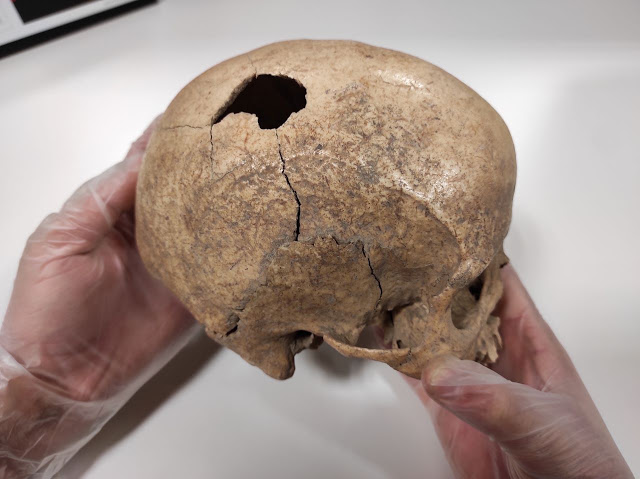 Крім того, у цієї людини було дві прижиттєві травми потиличної кістки і правої скроневої кістки, які повністю зажили, а також посмертний перелом в нижній частині потиличної кістки. Отже, в цьому черепі можна спостерігати різницю між прижиттєвими, передсмертними і посмертними ушкодженнями.