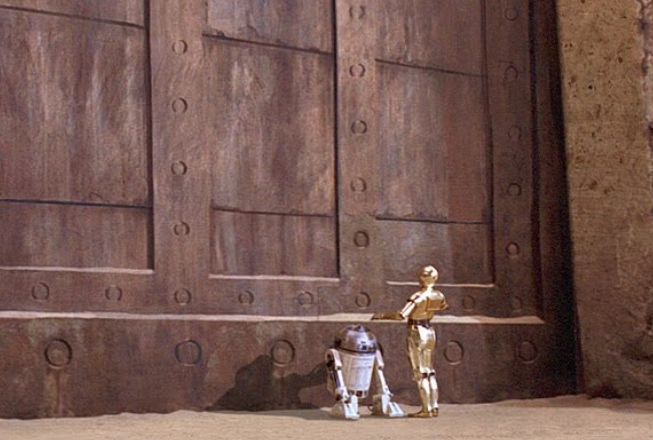 У фільмі "Зоряні війни" "Повернення джедая" (1983) R2-D2 та C-3PO прибувають до величезних дверей палацу Джабби