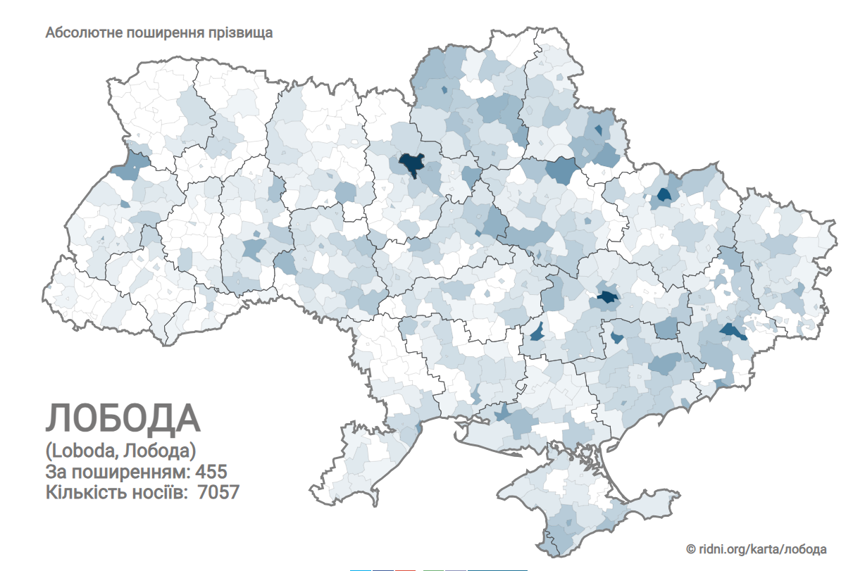 Ще одне "рослинне" прізвище Лобода найчастіше можна зустріти на Придніпров'ї. Воно налічує 7057 носіїв та займає 455 місце за поширенням.