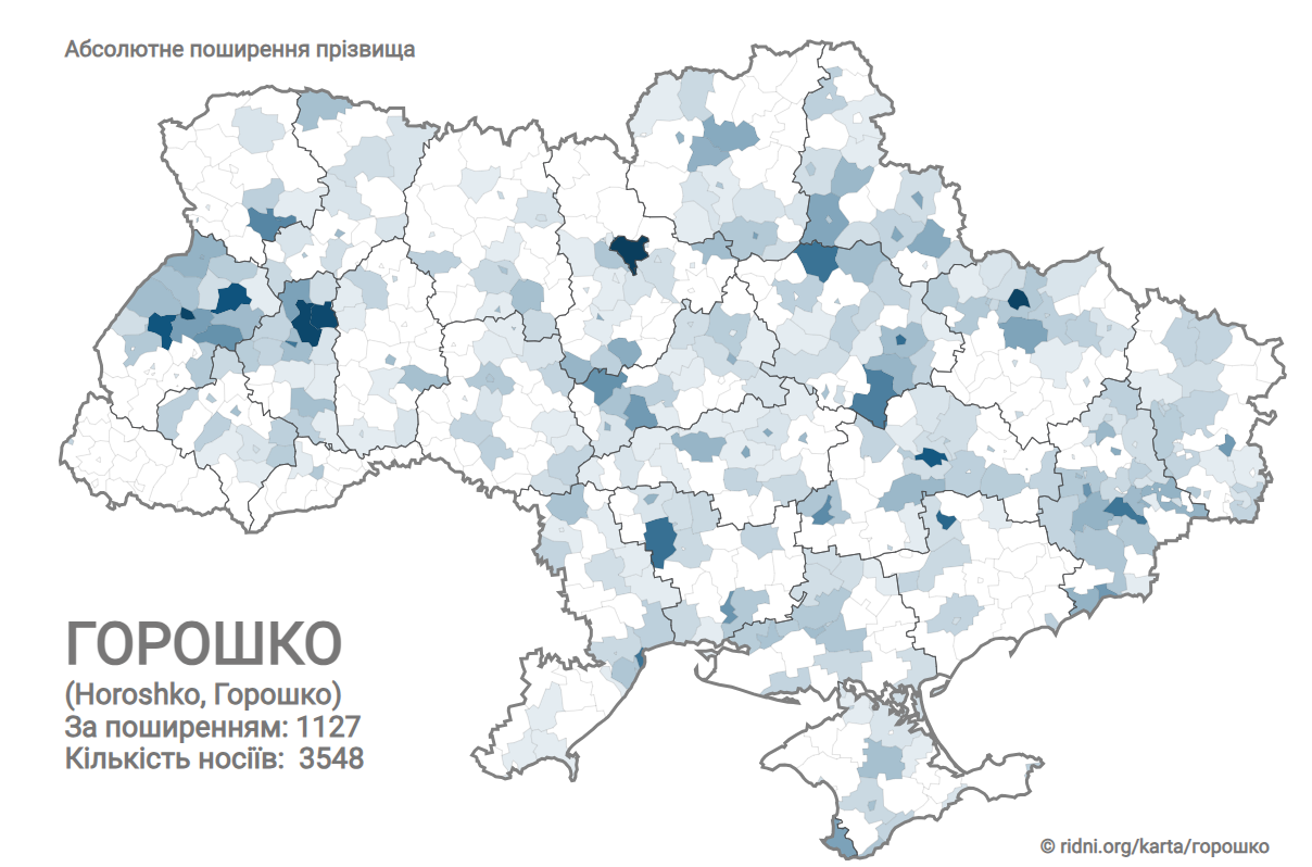 Інше, схоже прізвище Горошко, за поширенням займає 1127 місце, адже офіційно налічує 3548 носіїв.