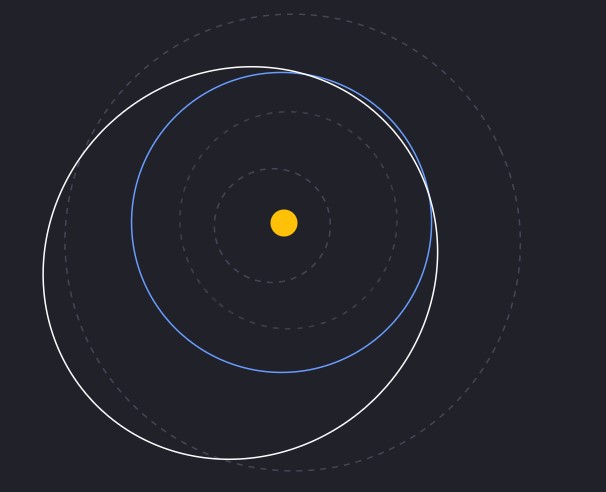 Синім позначено орбіту Землі, білим – астероїда, пунктиром – орбіти Меркурія, Венери та Марса