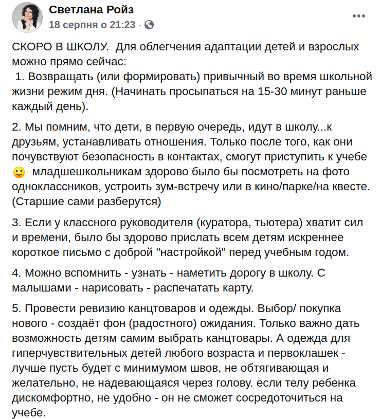 З 1 вересня в українських школах починається новий навчальний рік. У зв'язку з цим відомий психолог Світлана Ройз дала батькам поради, як полегшити адаптацію як самих дітей, так і дорослих.