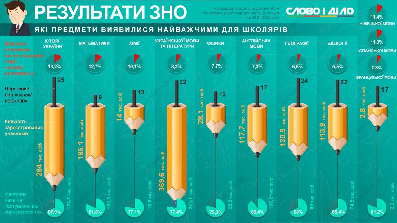 В Україні підвели підсумки зовнішнього незалежного оцінювання в 2020 році, в якому взяли участь 380 тисяч випускників. Найпопулярнішими предметами у майбутніх абітурієнтів були українська мова і література, історія та математика, а найскладнішими предметами виявилися історія України і математика - тест провалили 13,2% і 12,7% учнів відповідно.